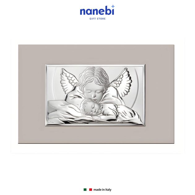 Guardian Angel with Baby – Silver Icon on Taupe Wood Frame