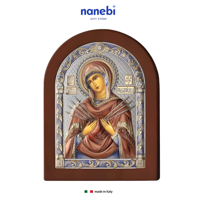 St. Mary of the Seven Sorrows – Silver & Color Icon on Arched Wood Panel