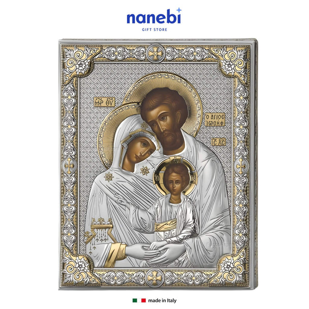Sacred Family Icon with Arched Wood Frame and Silver-Gold Accents